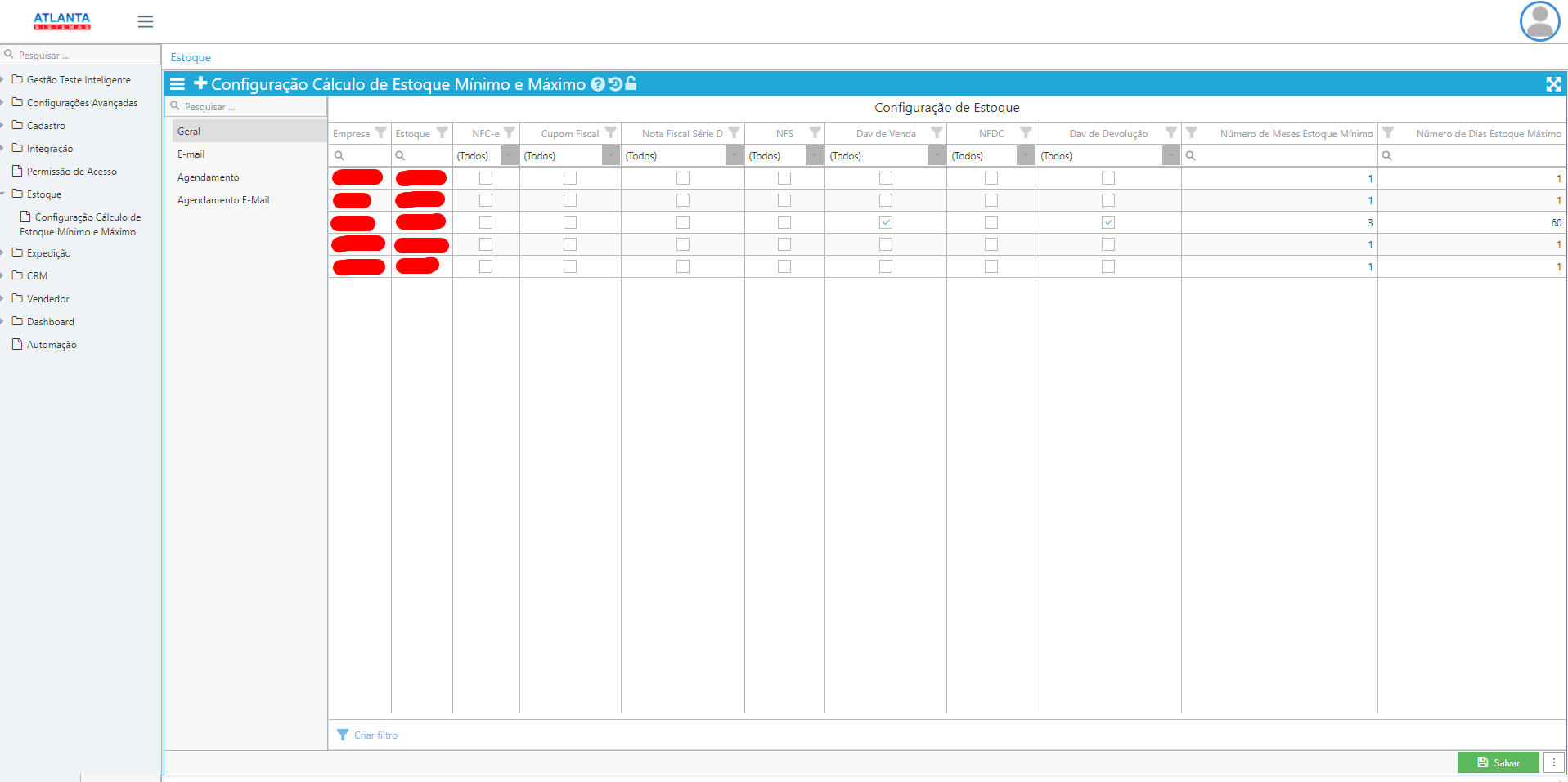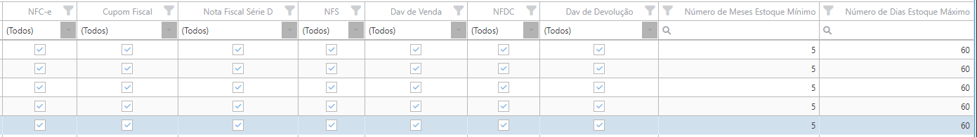 Colunas de Documentos: Configurar quais documentos vão ser considerados para se obter a média de quantidade vendida, sendo configurada para cada estoque.