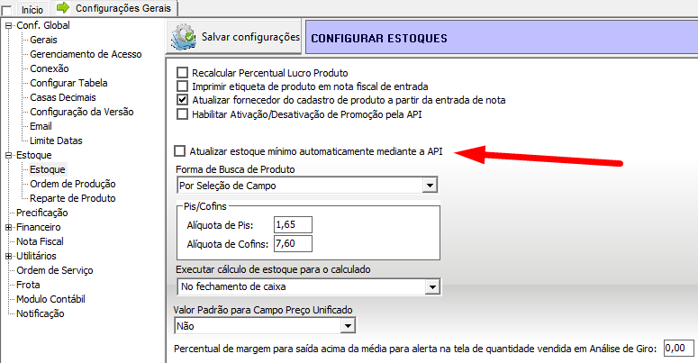 Para colocar o sistema WEB para calcular o estoque máximo e mínimo é necessário ativar a configuração no Hermes/Zeus, essa configuração pode ser encontrada na imagem abaixo: