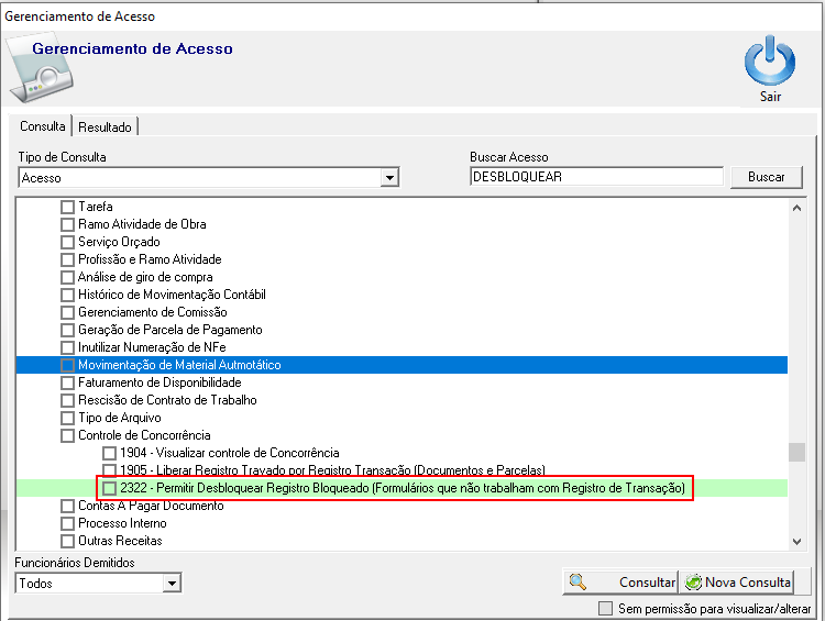 Caso o usuário tenha o acesso ao ponto 2322 o sistema irá perguntar se deseja destravar o registro.